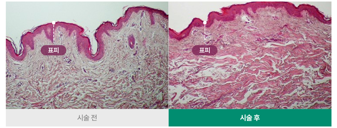 표피층과 진피층의 콜라겐 자극을 통한 수축을 유도하여 즉각적인 타이트닝 효과를 가져옵니다.