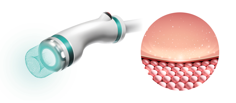 탑재된 냉각 시스템을 통해 표피의 손상없이 빠르고 정밀하게 깊숙한 진피층과 지방층까지 열에너지를 전달하여 콜라겐 재생, 지방세포 사멸효과를 만들어냅니다.